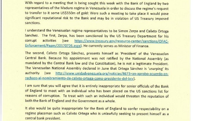 Por su parte, el parlamentario británico Andrew Lewer envió al banco una carta para que no recibiera a los funcionarios venezolanos, por carecer de "legitimidad" en sus cargos, pues a su juicio no fueron "aprobados" por la opositora Asamblea Nacional, un poder público declarado en desacato y, por tanto, invalidado para cualquier acción o decisión.