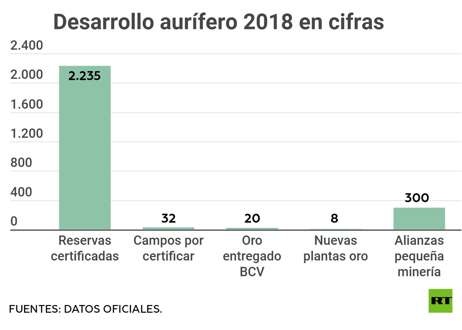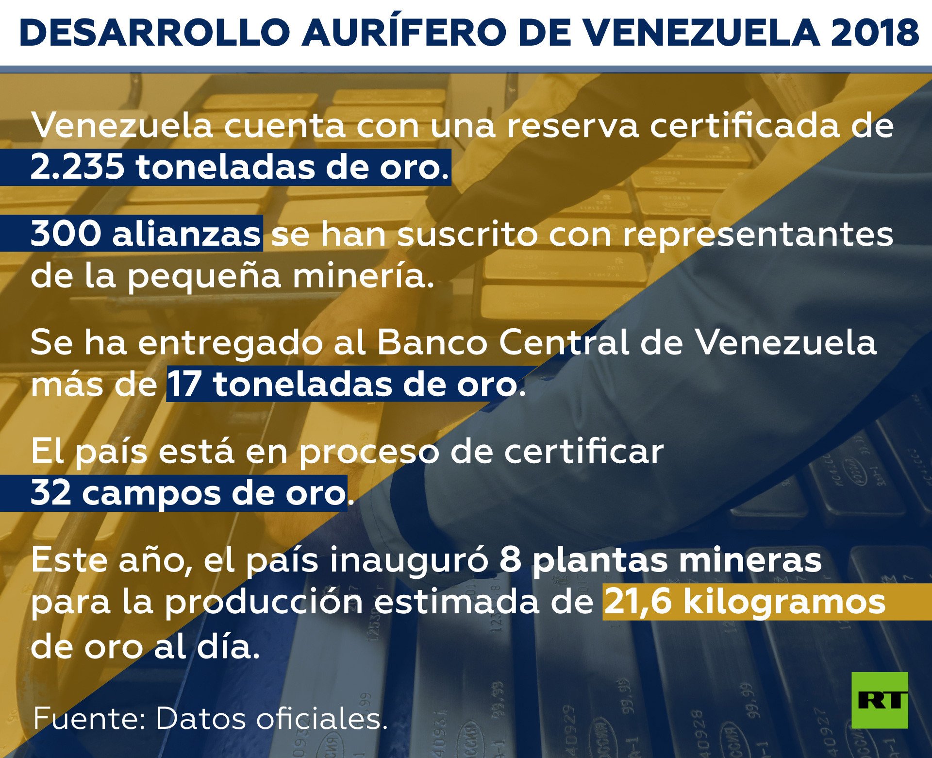 El ministro de Desarrollo Minero Ecológico de Venezuela, Víctor Cano, informó a RT que al cierre de 2018 el país cuenta con una reserva certificada de 2.235 toneladas de oro, de las cuales 1.400 toneladas son producidas mediante el proyecto 'Siembra Minera' (emprendido en alianza con capital privado). El resto se completa a través de las empresas del Estado y el trabajo de las comunidades mineras.