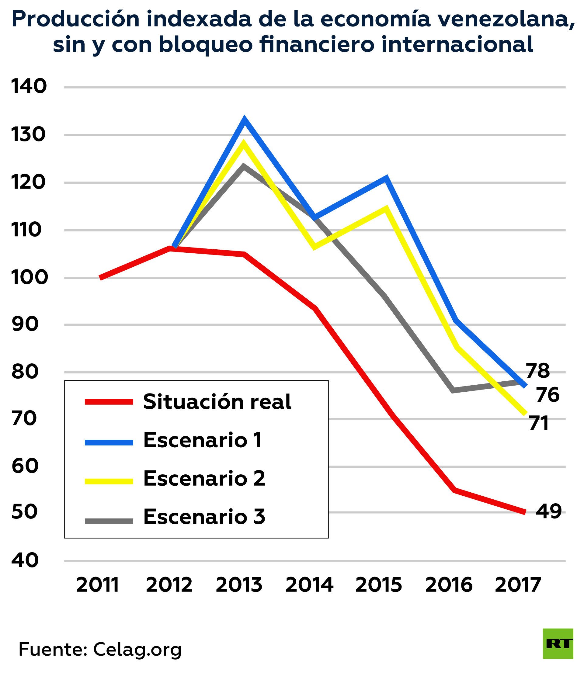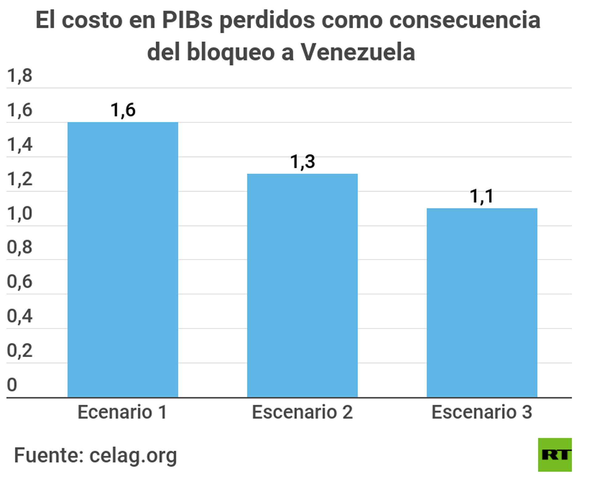 Los venezolanos perdieron, según los cálculos del Celag, entre 12.100 y 8.400 dólares per cápita entre los años 2013 y 2017 "como consecuencia directa del boicot financiero y comercial". Esto equivale a entre trece meses y un año y medio de producción de PIB del país.