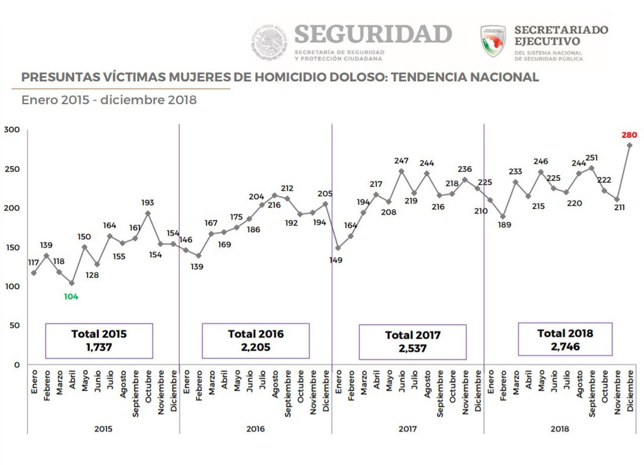 Según datos del Secretariado Ejecutivo del Sistema Nacional de Seguridad Pública (SNSP), en 2015 se registraron 422 asesinatos de mujeres por razones de género, mientras que en 2018 la cifra ascendió a 861.