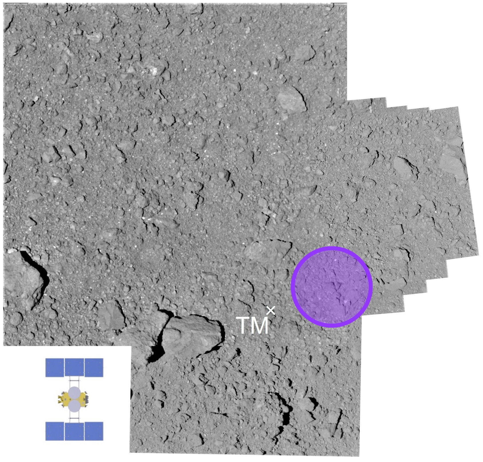 Una de las imágenes difundidas fue tomada a una altura aproximada de 25 metros cerca de un minuto después del aterrizaje. La publicación muestra que el color de la parte de la superficie de Ryugu donde se posó la nave "es diferente del entorno y quedó decolorada por el aterrizaje". "Por el momento, la razón de la decoloración se desconoce, pero quizás se deba a la arena que fue expelida hacia arriba por los propulsores de la nave espacial o por la bala", reza el comunicado emitido por la JAXA.