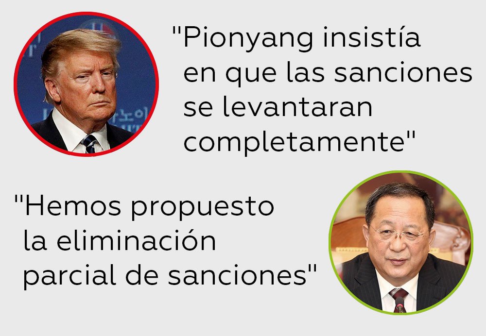 Estas afirmaciones contradicen las palabras de Trump. "Lo que hemos propuesto fue no la eliminación de todas las sanciones, sino una eliminación parcial" de estas, hizo hincapié Ri, añadiendo que el desmantelamiento de Yongbyon era la mejor propuesta posible para avanzar en la desnuclearización en estos momentos.