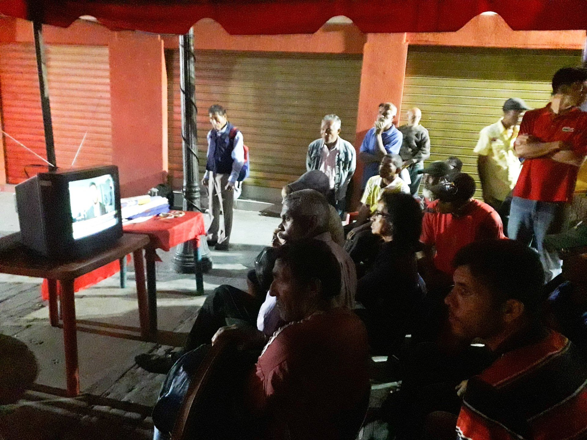 Al caer la noche, en la 'Esquina Caliente', histórico bastión del chavismo, a solo pasos de la sede de la Asamblea Nacional y de la cancillería, dispusieron de un televisor, alimentado con una planta eléctrica, donde los presentes escuchaban atentamente las palabras del ministro de la Defensa, Vladimir Padrino López, después de 24 horas sin poder ver señal televisiva alguna. Las cabezas asentían mientras decía: "Todos los venezolanos debemos rechazar al unísono el ataque del sistema eléctrico".