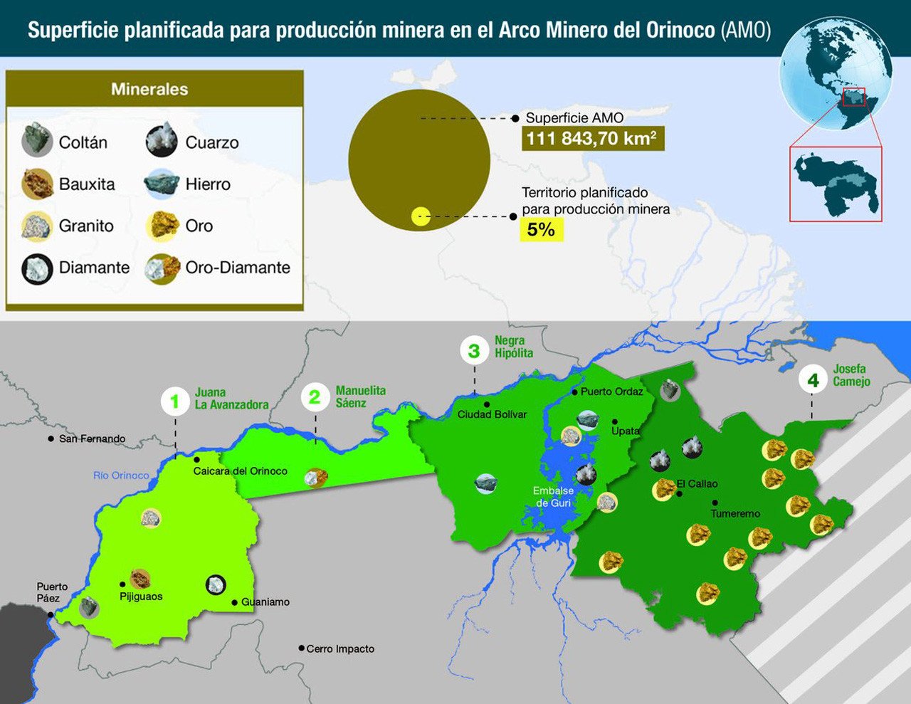 En 2016 el Ejecutivo declaró como zona de "desarrollo estratégico nacional" un área de 111.843,60 kilómetros cuadrados en el estado Bolívar, al sureste del país, llamada 'Arco Minero del Orinoco', como parte de la recuperación de la soberanía de la actividad minera en la zona.