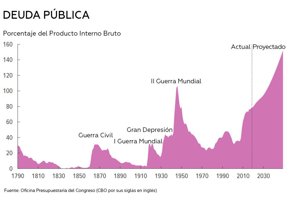 Una gráfica de la dinámica de la deuda pública estadounidense difundida esta semana por la Oficina Presupuestaria del Congreso de EE.UU. muestra un auge en desarrollo desde el año 2010 comparable solo con la II Guerra Mundial. La previsión para la década del 2030 supone que superará el pico correspondiente a la principal contienda del siglo XX e irá más allá exponencialmente.