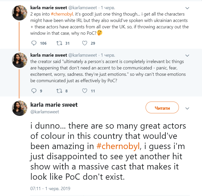 La guionista reconoció finalmente en otro tuit la ausencia de gente de color en la Unión Soviética, pero sugirió que, pese a ello, los creadores deberían haber optado por un elenco de aspecto más diverso, alegando que ya habían faltando a la fidelidad histórica eligiendo a actores que hablan con acento británico.