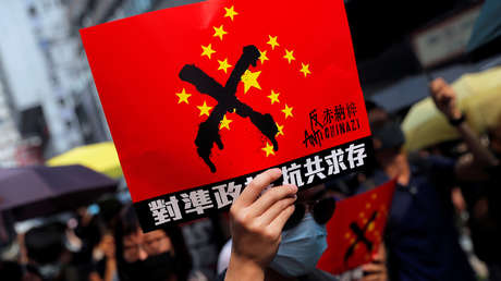 La bandera china apareció en las protestas con las estrellas reubicadas en forma de esvástica en repudio al Gobierno central de Pekín, tachado por los manifestantes como "Chinazi".