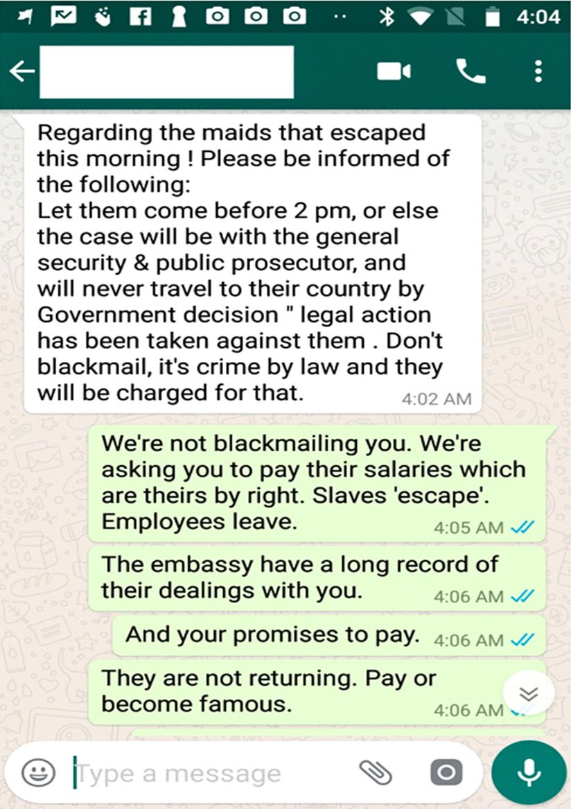 Según Human Rights Watch, en Líbano, un país con una estimación de población de unos seis millones de habitantes (el último censo poblacional se hizo en 1932) trabajan un total de unas 250.000 trabajadoras del hogar, lo que supone un 4 % del total poblacional del país. Esto, dicho así, puede parecer no tener la relevancia real que verdaderamente entraña; pero, según el artículo 7 de la ley de los trabajadores del país, las mujeres afectadas no tienen derecho a ser reconocidas como tales, por lo que no gozan de protección ni de derechos laborales.