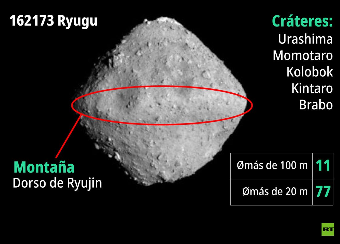 El cráter más grande, bautizado por los científicos nipones como Urashima, ocupa una superficie equivalente a un tercio del diámetro del propio asteroide. Otros 10 cráteres superan los 100 metros de ancho y cinco de ellos se alinean a lo largo de una 'cordillera' que rodea el ecuador del cuerpo celeste.