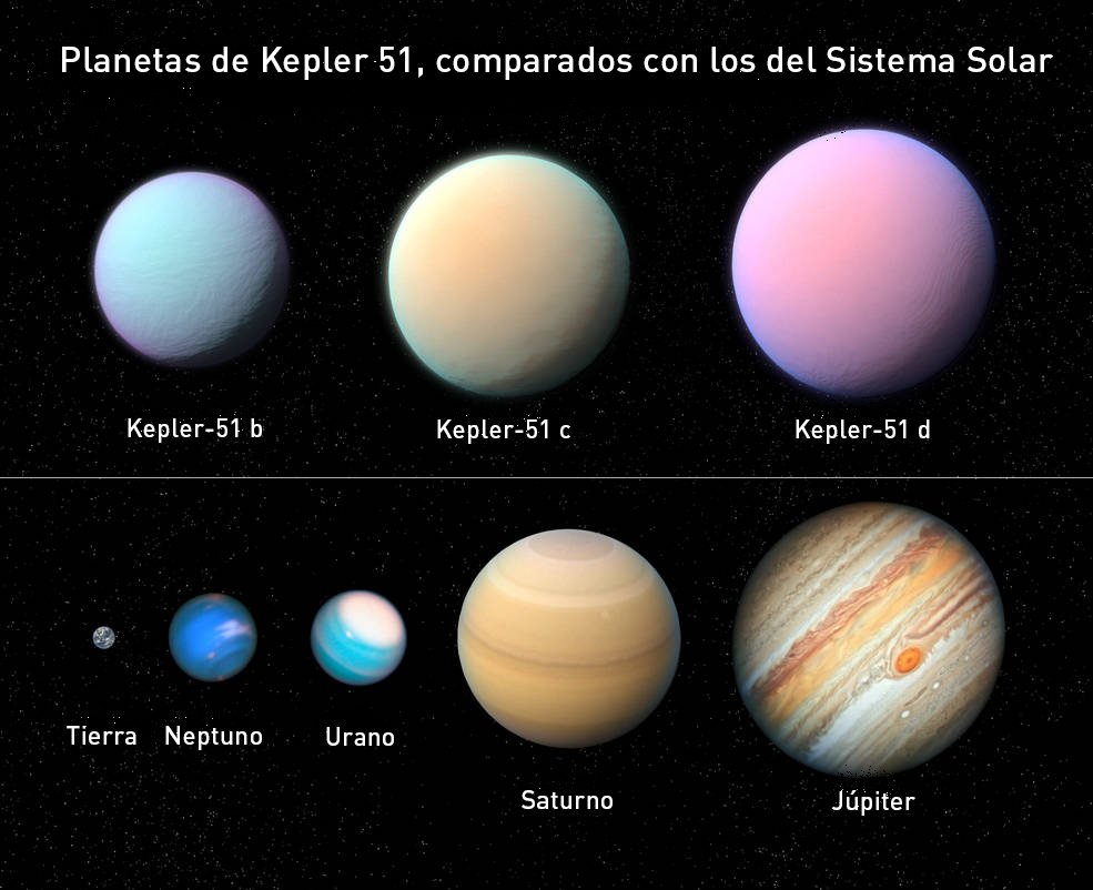 Tres exoplanetas jóvenes que se encuentran en el sistema Kepler 51, descubiertos por el telescopio espacial Hubble de la NASA en 2012, tienen unas densidades de masa tan bajas que, pese a que sus dimensiones son comparables con las de Júpiter, son 100 veces más ligeros que el planeta más grande de nuestro sistema solar.