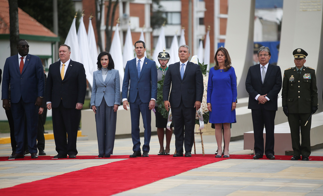 Previamente, durante su intervención en la conferencia antiterrorista, Pompeo dijo: "Debemos seguir luchando contra el terrorismo donde aparezca, y no me refiero solamente a aquellos que detonan bombas y actúan con armas, sino a las redes que lo facilitan, por ejemplo el régimen de (Nicolás) Maduro apoya a grupos terrorista como disidentes de las FARC (Fuerzas Armadas Revolucionarias de Colombia) y el ELN (Ejército de Liberación Nacional) (...) por eso estamos aquí apoyando a Juan Guaidó".