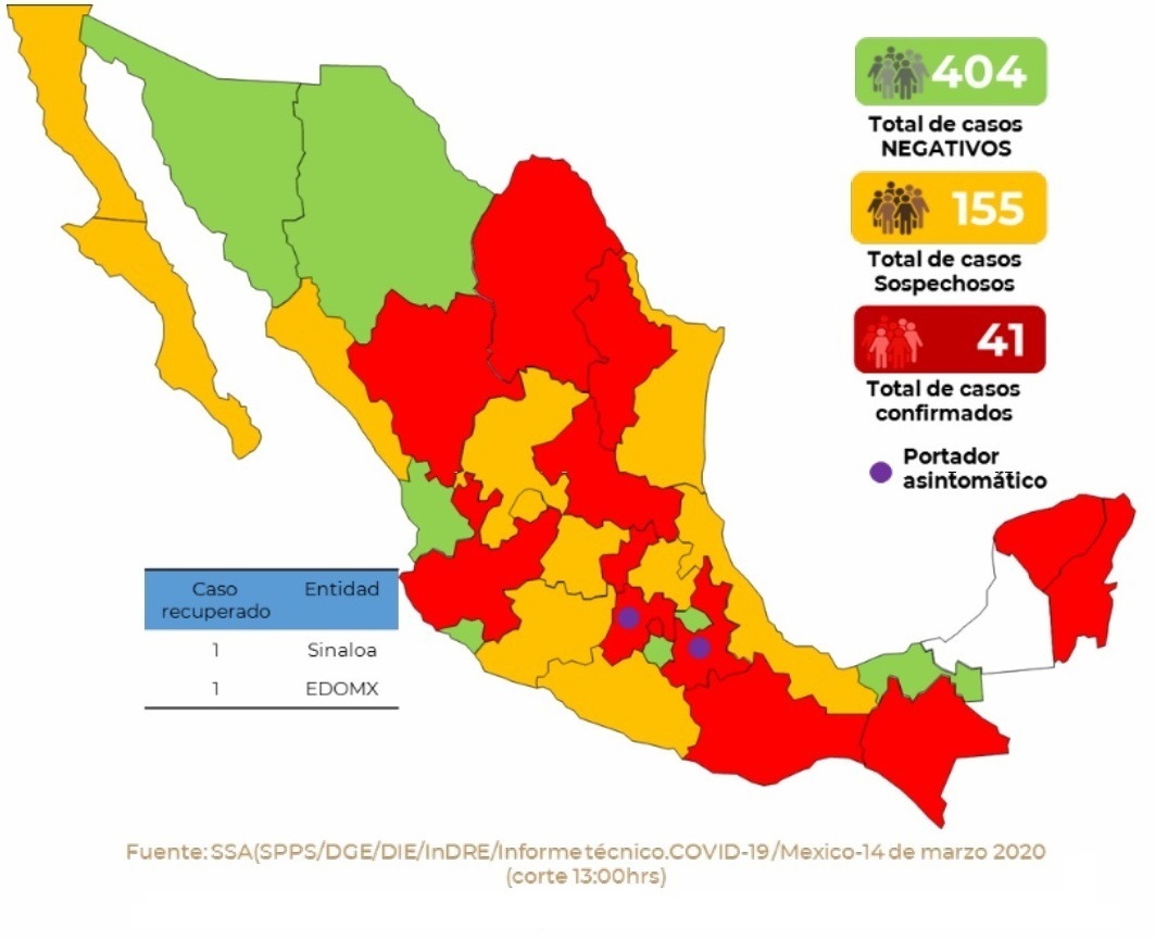 Además, se han registrado 155 casos sospechosos, mientras que otras 404 personas dieron negativo en la prueba para diagnosticar el contagio con el virus. Hasta la fecha, dos pacientes se han recuperado de covid-19, en Sinaloa y el estado de México.
