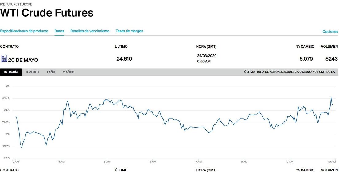Los futuros del petróleo WTI para mayo a las 5:14 (GMT) también han subido hasta 24,47 dólares por barril, lo que representa un aumento de 1,10 dólares o el 4,71%.