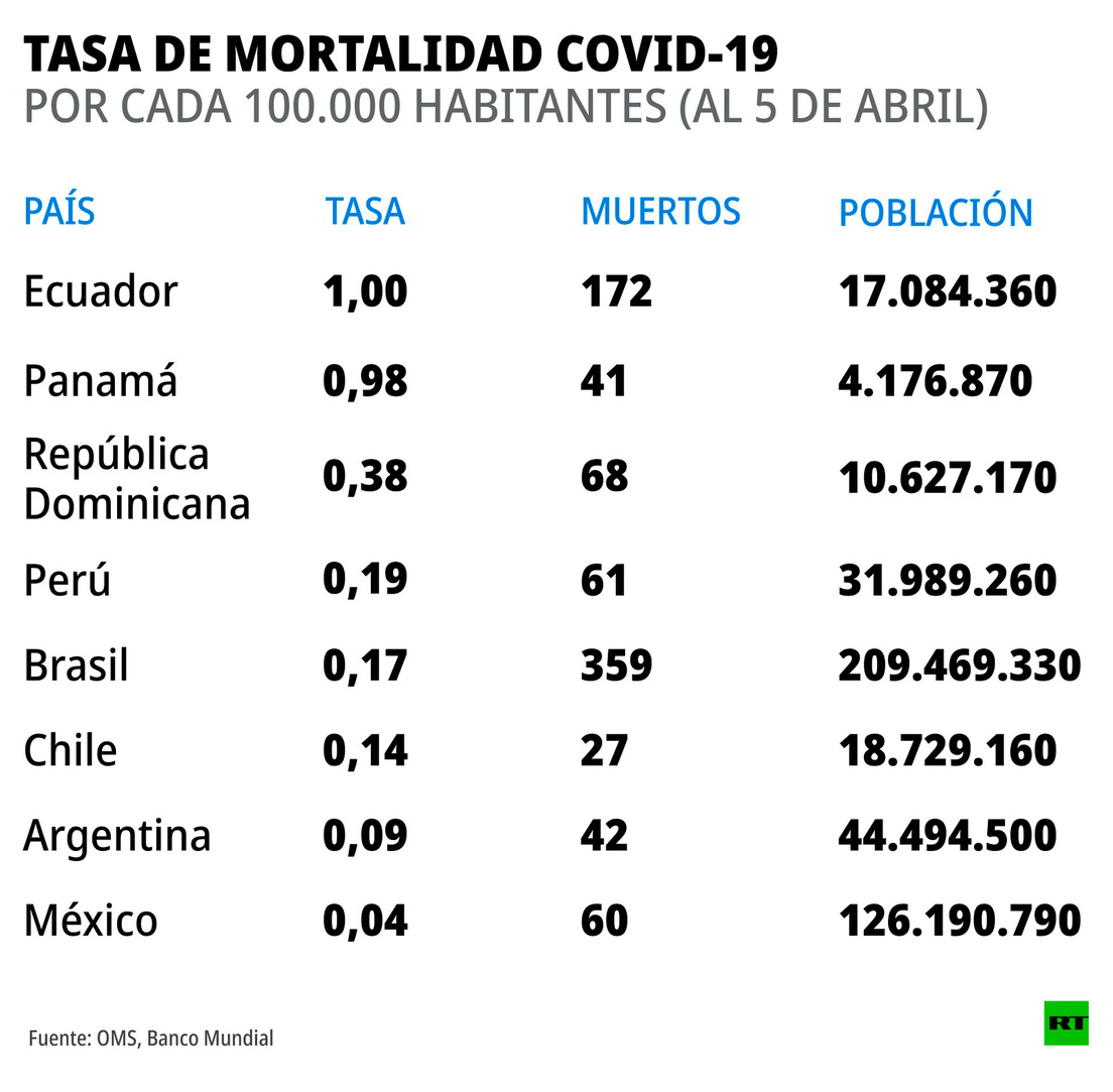 Hasta el 5 de abril, la Secretaría de Salud en México reportó un total de 2.143 casos confirmados y 94 defunciones confirmadas por covid-19. En esta misma fecha, según la OMS, la tasa de mortalidad se situaba en el país en 0,4 por cada 100.000 habitantes.