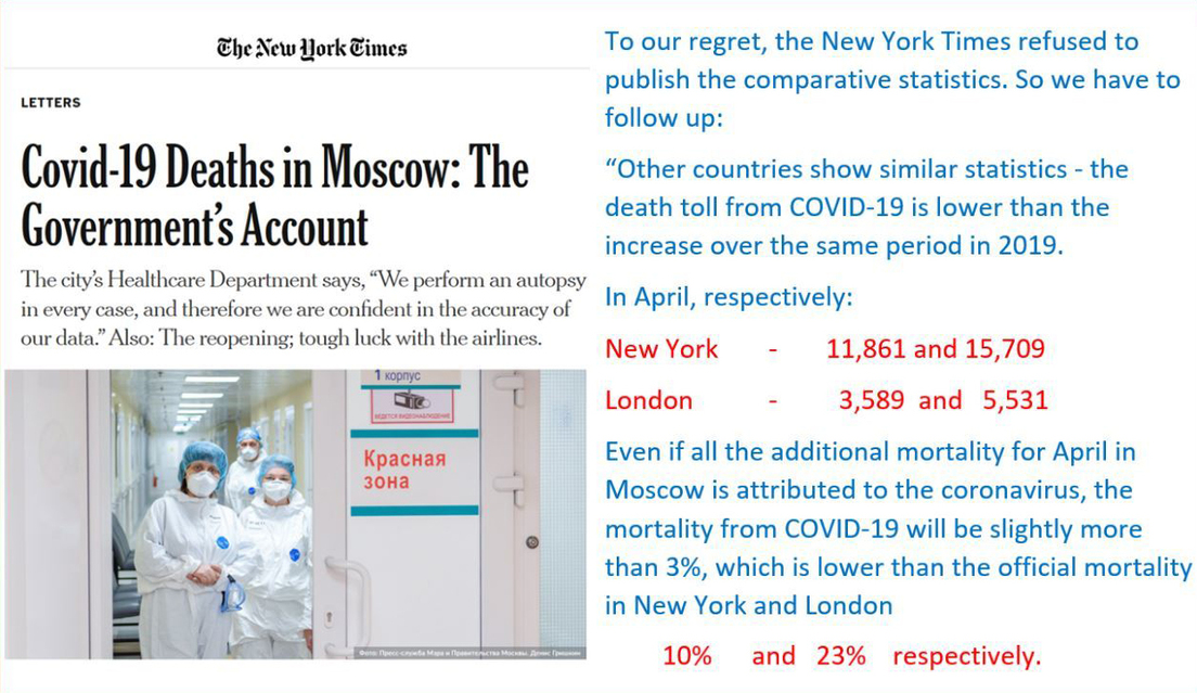 Esta es la versión publicada por NYT: "Otros países muestran estadísticas similares, con una tasa de mortalidad por covid-19 menor que el aumento general en la tasa de mortalidad. Pero incluso si todas las muertes adicionales para abril en Moscú se atribuyeran al coronavirus, la tasa de mortalidad de Moscú por covid-19 sería más baja que las tasas en Nueva York y Londres".