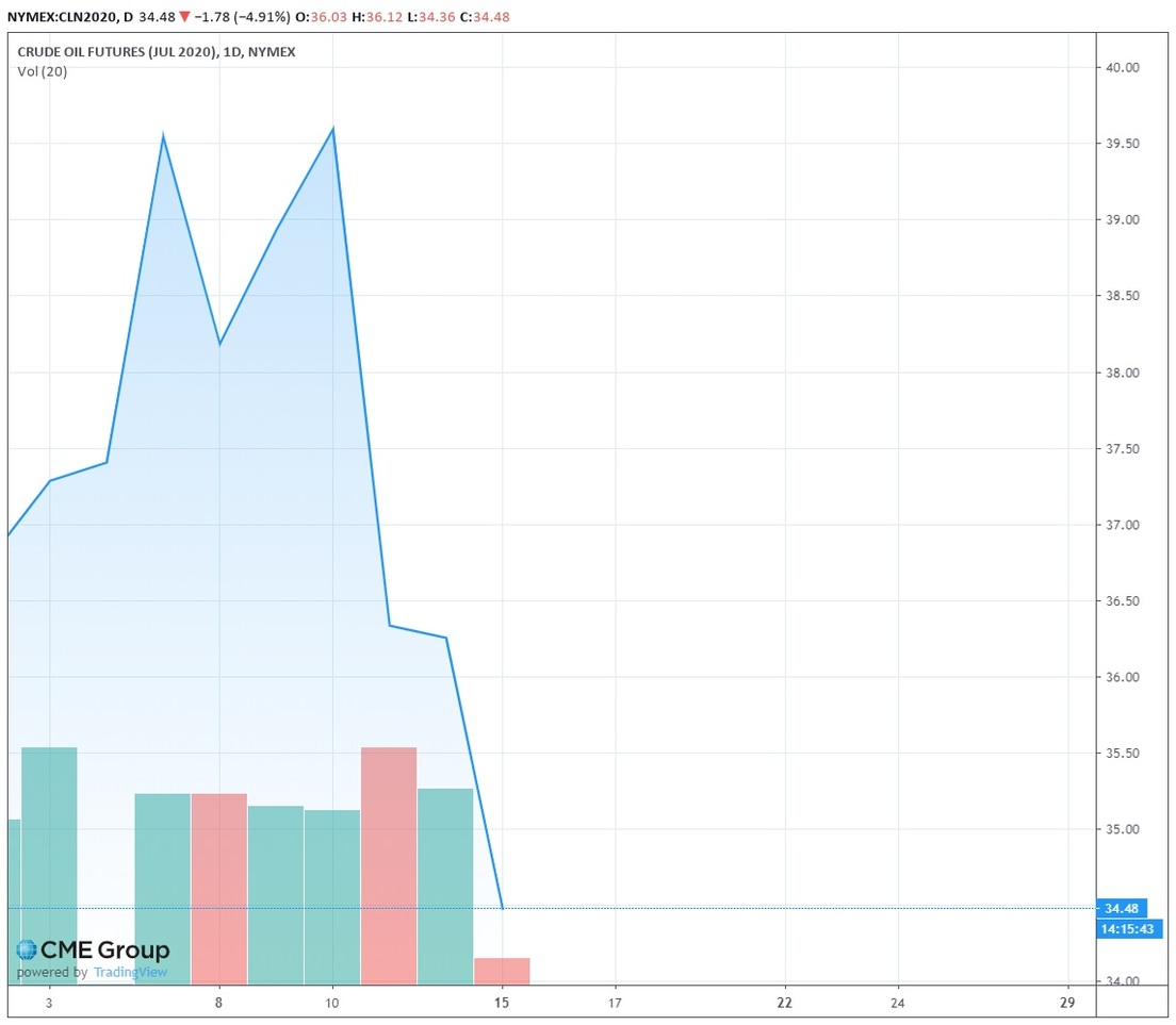 De acuerdo con los datos de la Bolsa Mercantil de Chicago (CME, por sus siglas en inglés), el precio de los futuros para agosto del crudo europeo de referencia internacional Brent a la hora de la apertura de la sesión se ha situado en 38,69 dólares y luego ha bajado hasta los 37,24 dólares, lo que representa una caída de casi el 4%.