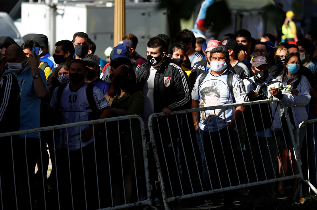Parejas, grupos de amigos y solitarios arriban armados con reposeras, mantas y termos para esperar con paciencia a que se abran las puertas de la Casa Rosada que ya luce un gigantesco moño luctuoso en su fachada. Ahí, en el Salón de los Patriotas Latinoamericanos, el mismo en donde hace 10 años una multitud despidió al expresidente Néstor Kirchner, ya está el féretro de Maradona.