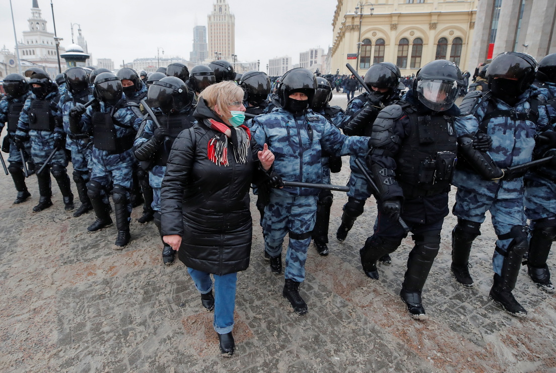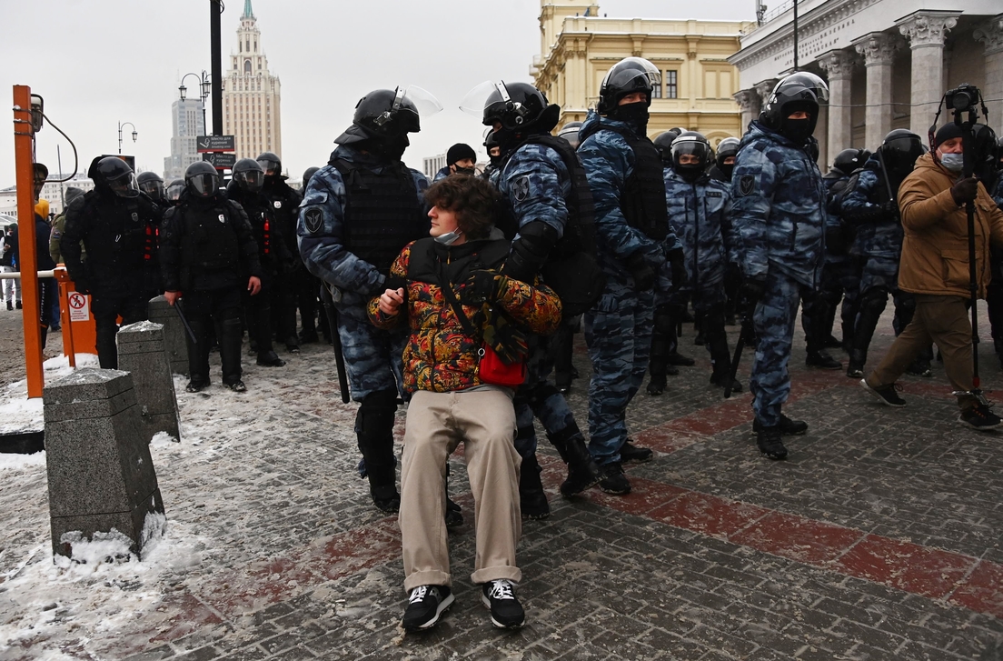 La detención de una persona durante una protesta en Moscú, Rusia, el 31 de enero de 2021