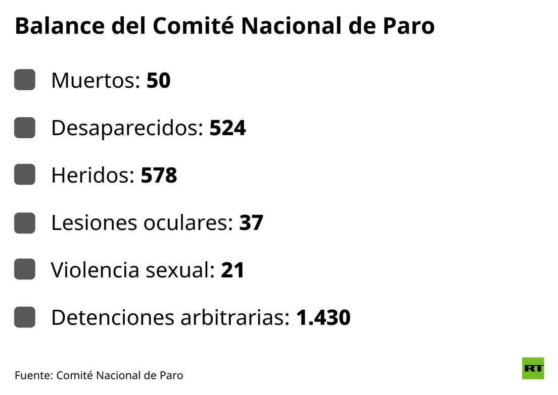 Por su parte, el Comité Nacional de Paro ha ofrecido otras cifras. En un comunicado que emitió el pasado domingo, la organización elevó a 50 el número de muertos durante las protestas y se los atribuye a "la brutal violencia policial desatada" contra los manifestantes.