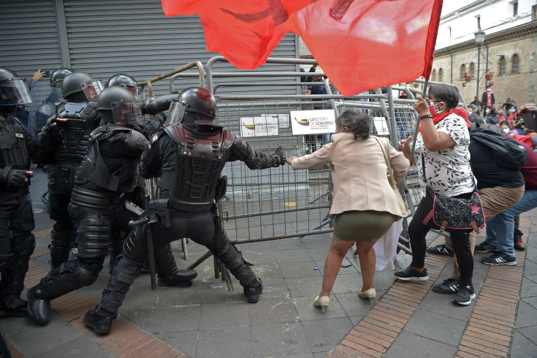 En las inmediaciones de la Caja del Seguro, en Quito, centrales sindicales inauguran la 1ra jornada de movilizaciones en contra de las medidas neoliberales de @LassoGuillermo. La marcha tiene una fuerte custodia policial y está prevista en avanzar hasta Carondelet. #ParoNacionalpic.twitter.com/YNxEsJvjbZ