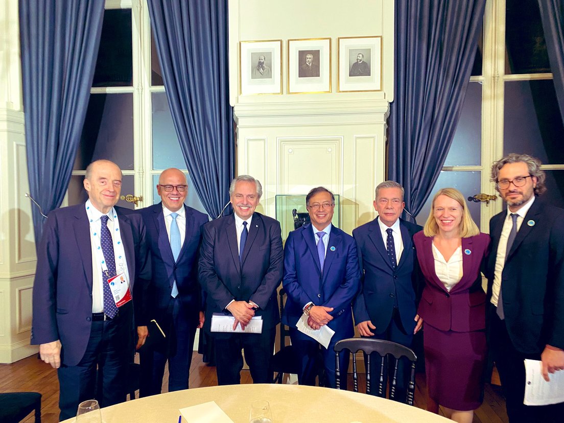 "Yo creo que en este marco, en el que un diálogo de este tipo necesita amigos, hoy hemos encontrado tres verdaderos amigos, el presidente Macron, el presidente Fernández y el presidente Petro", dijo.