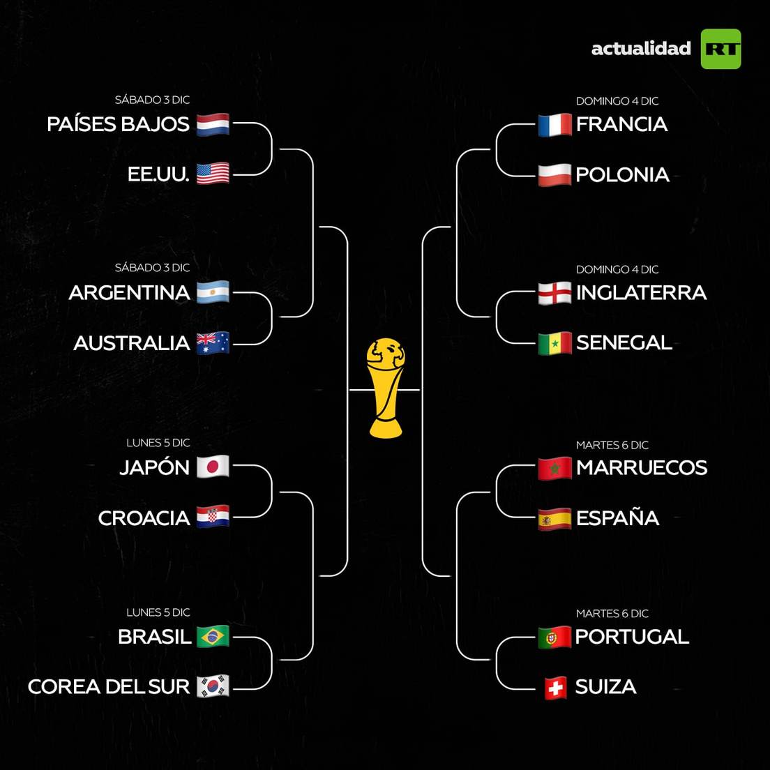 Los Países Bajos y Estados Unidos abrirán la ronda de octavos este sábado. Ese mismo día, se jugará el Argentina-Australia. El domingo, Francia se enfrentará a Polonia, seguido por el Inglaterra-Senegal. El lunes 5 de diciembre será el turno de Japón y Croacia y el Brasil-Corea del Sur. En la última jornada España se medirá a Marruecos, y Portugal ante Suiza.