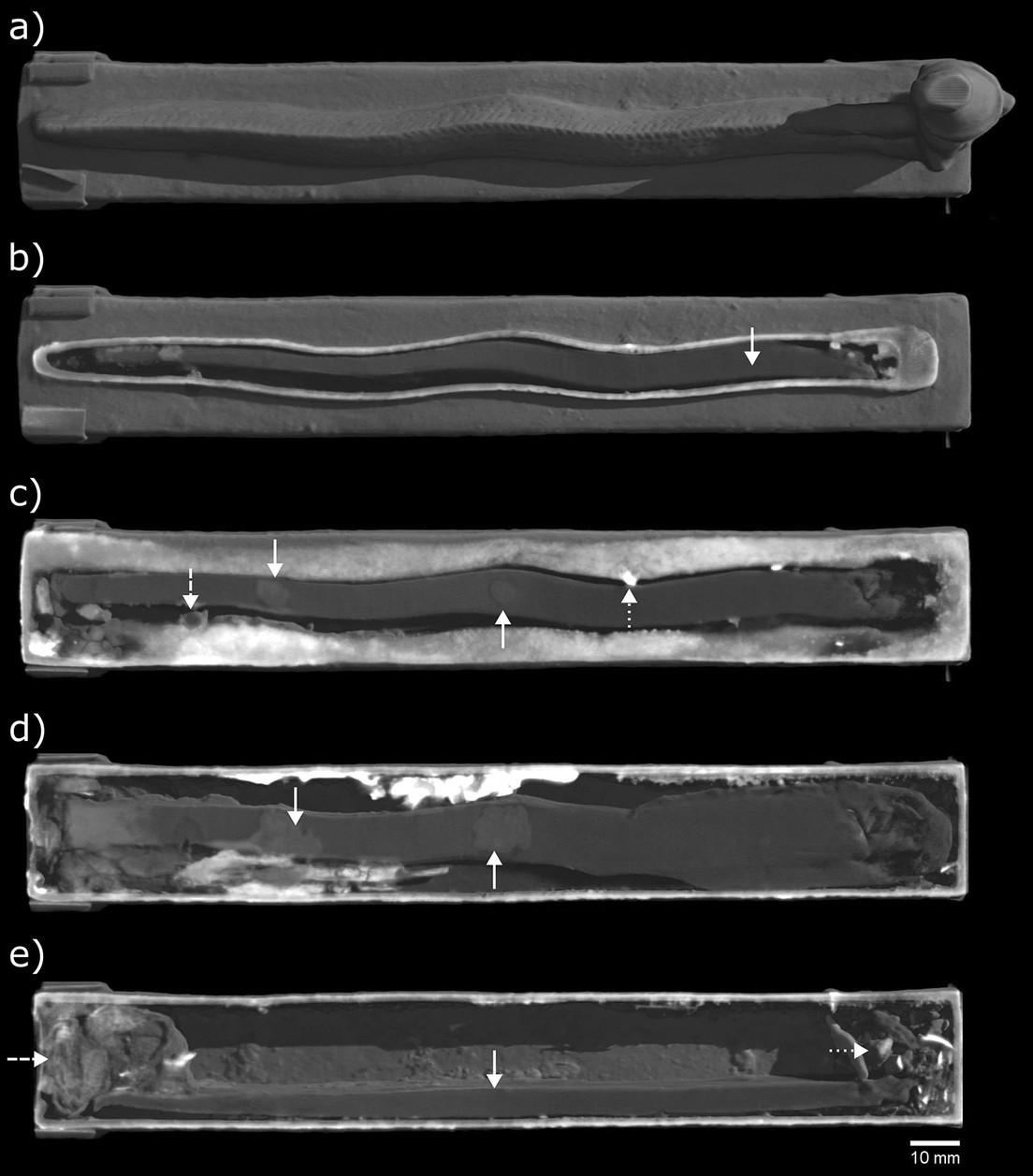 Los científicos destacan que lograron identificar los restos gracias a las imágenes obtenidas por tomografía de neutrones, que recopila información sobre la estructura dentro de un objeto al determinar cómo lo atraviesa un haz de neutrones. Aseguran que este método es más eficaz para observar a través de metales que los rayos X y recalcan que es una técnica no invasiva, dado que no causa ningún daño a los objetos arqueológicos analizados.
