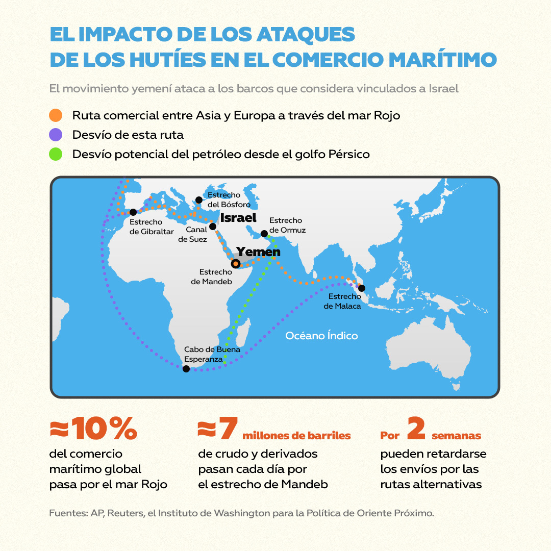 - El movimiento de los hutíes rebeldes Ansar Allah anunció en noviembre su intención de atacar en el mar Rojo a cualquier barco que tenga bandera israelí, que sea de propiedad israelí o esté operado por empresas del país hebreo.