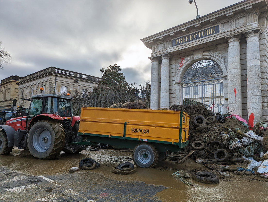 Los granjeros franceses llevan varios días manifestando su descontento con las políticas agrícolas del Gobierno de Emmanuel Macron y de la UE mediante el bloqueo de carreteras, concentraciones frente a edificios gubernamentales y marchas de tractores. En la ciudad de Agen, los granjeros arrojaron tripas, estiércol y otros desechos a las puertas de la sede administrativa del departamento de Lot y Garona, mientras diversos bloqueos de carreteras paralizaron el tráfico. Según FranceInfo, este miércoles se produjeron 300 kilómetros de atascos en todo el país.