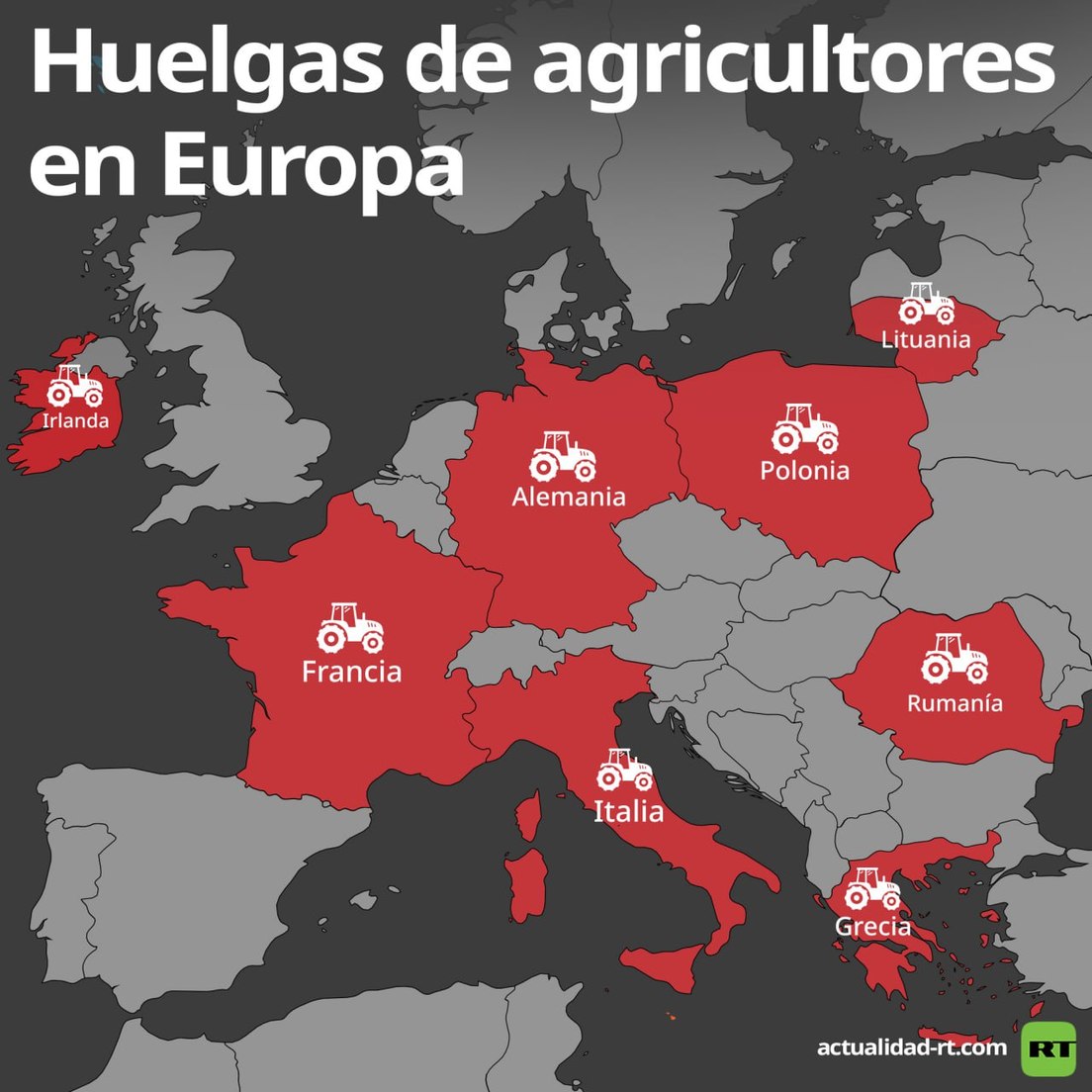 A su vez, agricultores españoles se declararon en huelga por los planes de restringir el uso del agua del río Tajo. En Francia, el impulso de las protestas el año pasado fue la prohibición de los pesticidas. La oleada de manifestaciones de agricultores también llegó a la principal economía de la UE. La decisión del Gobierno de Alemania de recortar las subvenciones al gasóleo para la maquinaria agrícola también provocó el descontento de los actores del sector. Actualmente, se están desarrollando protetas en Francia, Alemania, Rumanía, Polonia, Lituania, Italia y Grecia.