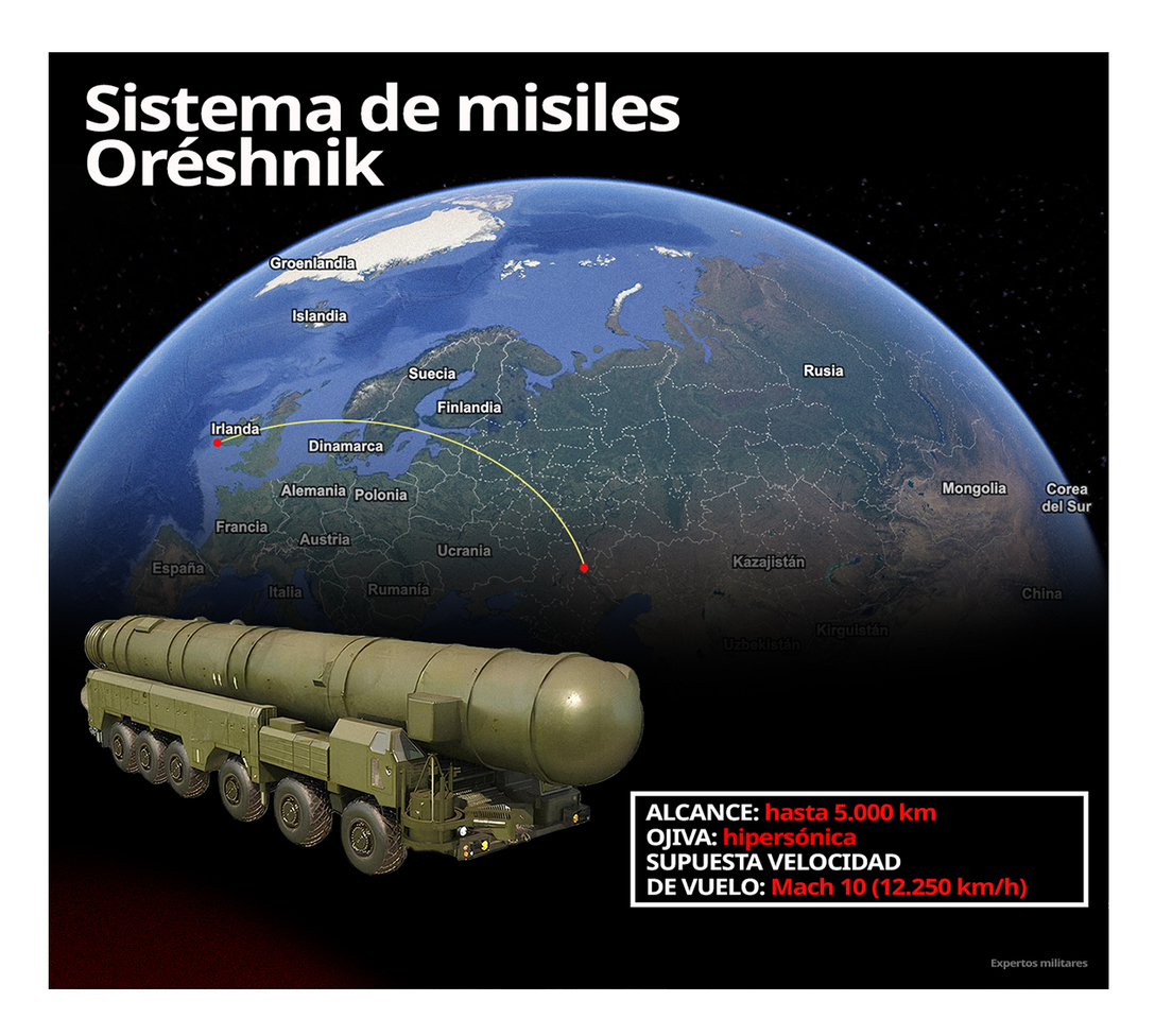 "Y ese fue exactamente el mensaje que envió el presidente [de Rusia Vladímir] Putin en su discurso y el que enviaron nuestros militares al lanzar este nuevo misil, un misil de alcance intermedio llamado Oréshnik", concluyó Riabkov.