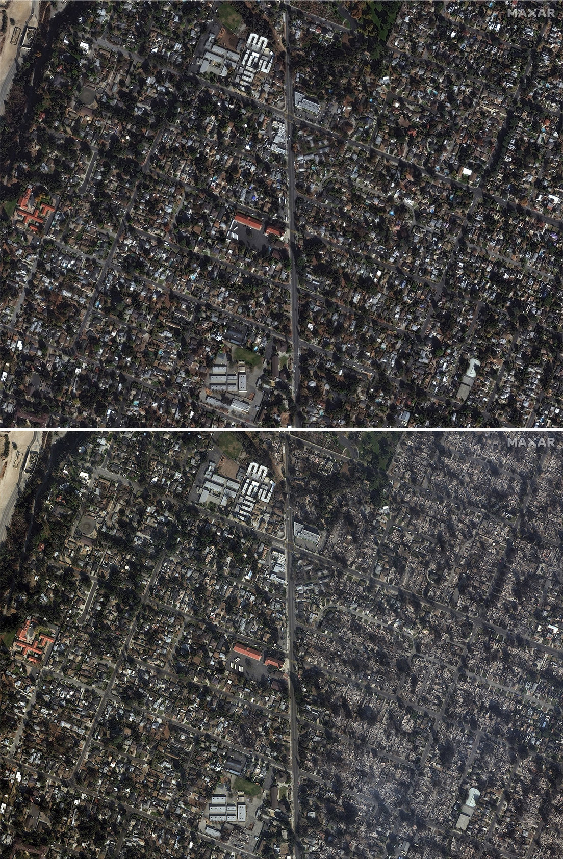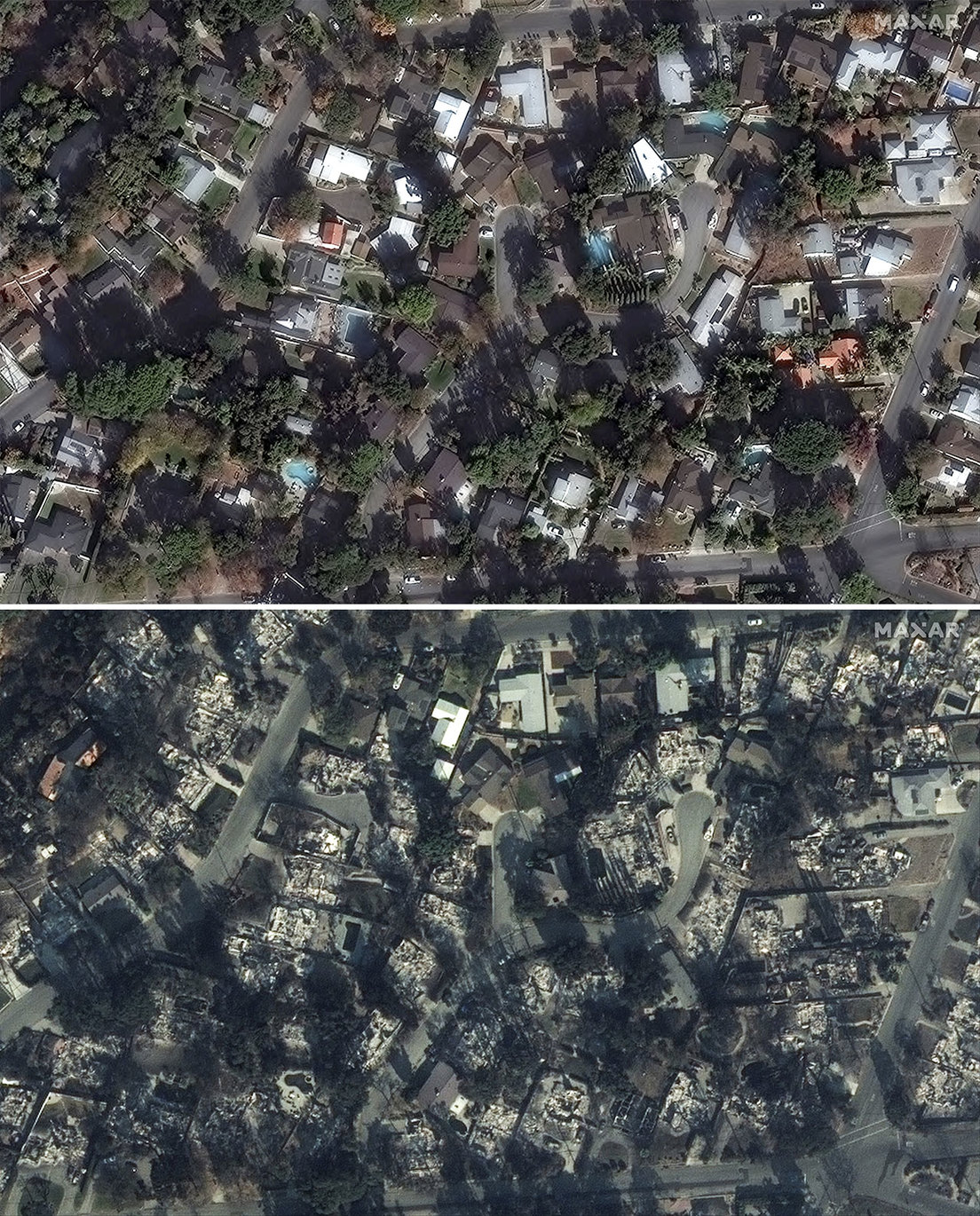 El proveedor de imágenes satelitales Maxar Technologies ha proporcionado nuevas fotos que muestran el alcance de la destrucción causada por los devastadores incendios forestales que están azotando el sur de California.