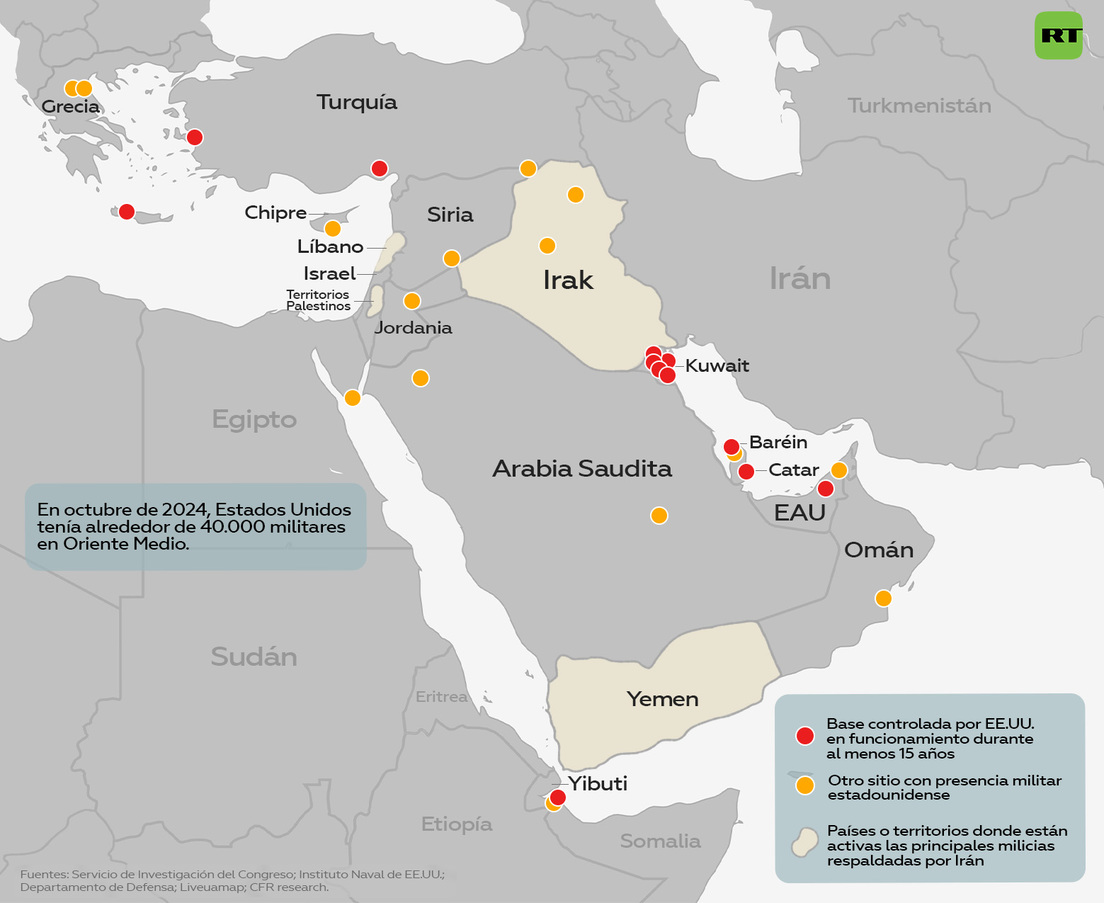 Catar alberga la mayor instalación estadounidense en la región, la Base Aérea de Al Udeid. Es un centro clave para operaciones aéreas y el Mando Central (CENTCOM). Mientras que Baréin, sede de la Quinta Flota de la Armada, acoge la mayor cantidad de personal estadounidense asignado de forma permanente, recogía CFR en su informe.