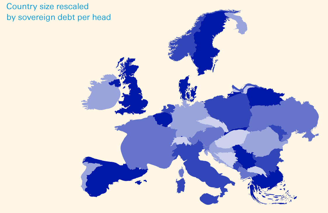 Además, Europa Central aparece mucho más pequeña de lo que es, mientras que Francia es dos veces mayor que Alemania. Por su parte, la República de Irlanda es casi del mismo tamaño que el Reino Unido, que no forma parte de la eurozona y mantiene su tamaño natural.
