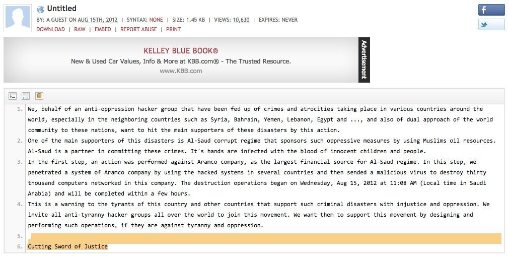 La misma frase utilizaron los atacantes iraníes contra AramCo, la petrolera de Arabia Saudita, de agosto de 2012.