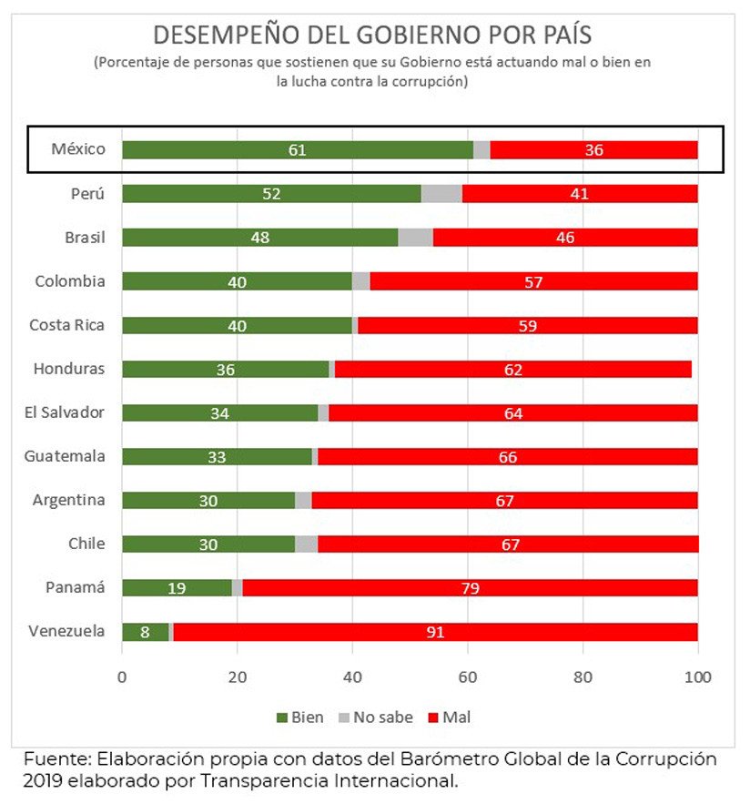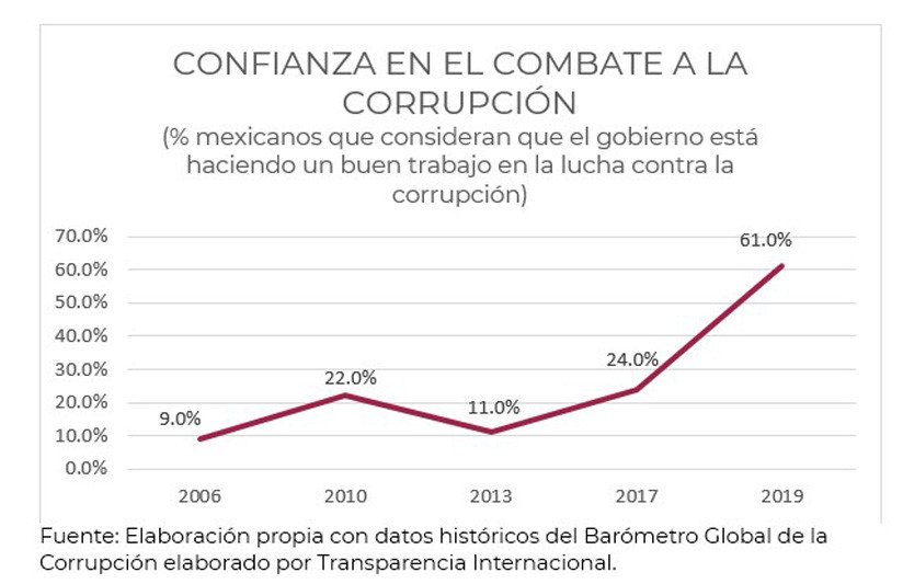 Un estudio reciente de Transparencia Internacional lo demuestra. Entre 2017, todavía con Enrique Peña Nieto, y 2019, ya con López Obrador, el porcentaje de mexicanos que consideran que el Gobierno está haciendo un buen trabajo en la lucha contra la corrupción subió de 24 % a 61 %. ¡Un salto de 37 puntos!