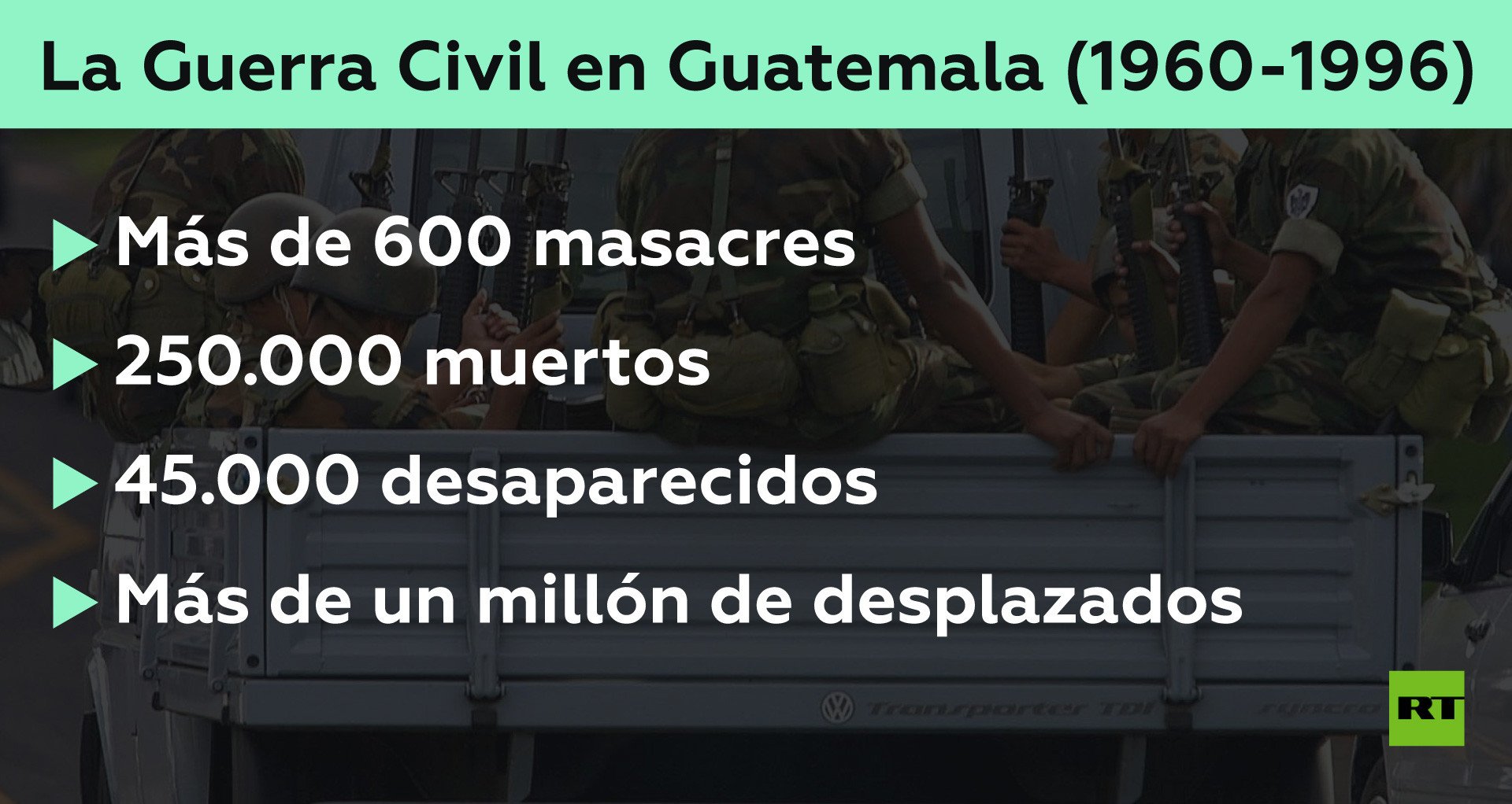 Guatemala es un país sumido en el horror de una guerra civil durante casi cuarenta años que cuando todavía no ha recuperado el pulso se encuentra dividida a causa de la modificación de la ley de amnistía que pretende olvidar más de 250.000 muertos, más de 600 masacres, 45.000 desaparecidos y más de un millón de personas desplazadas. Olvido que se produce en un país de unas riquezas innegables —el quinto país exportador del mundo de café y azúcar— y una pobreza extrema por cuanto el 49% de los menores de 5 años sufre desnutrición crónica, tasa que se sitúa en el cuarto puesto a nivel mundial por detrás de Burundi, Tanzania y Zambia.