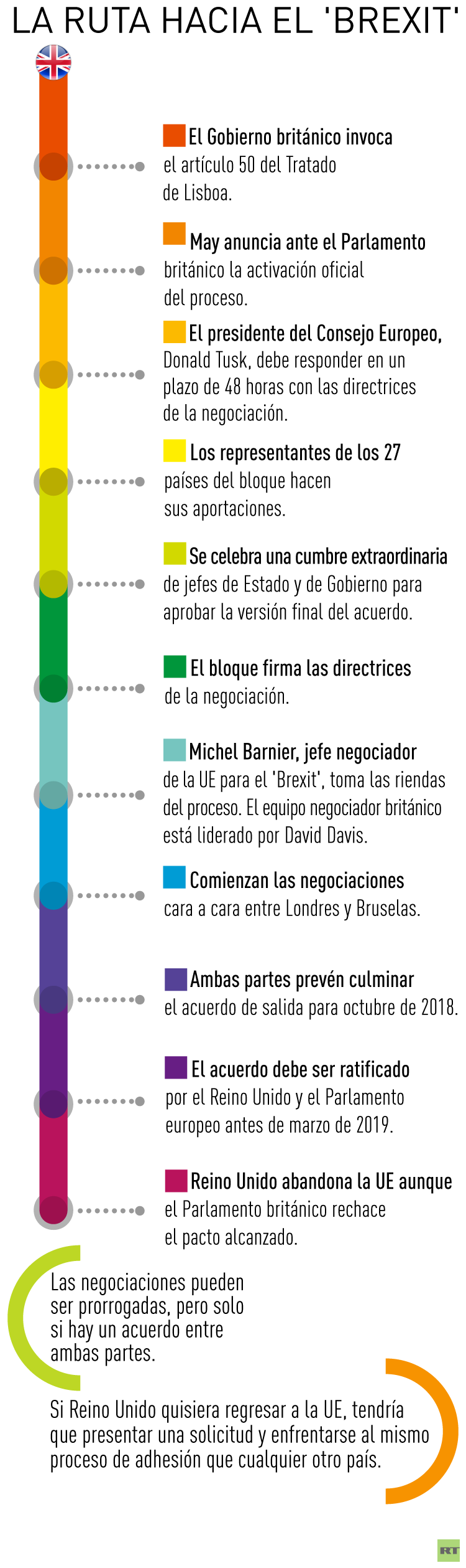 Con la firma de la primera ministra británica Theresa May de una carta dirigida al presidente del Consejo Europeo, Donald Tusk, en la que invoca al artículo 50 del Tratado de Lisboa, arranca formalmente la cuenta atrás irreversible del proceso del 'Brexit'.