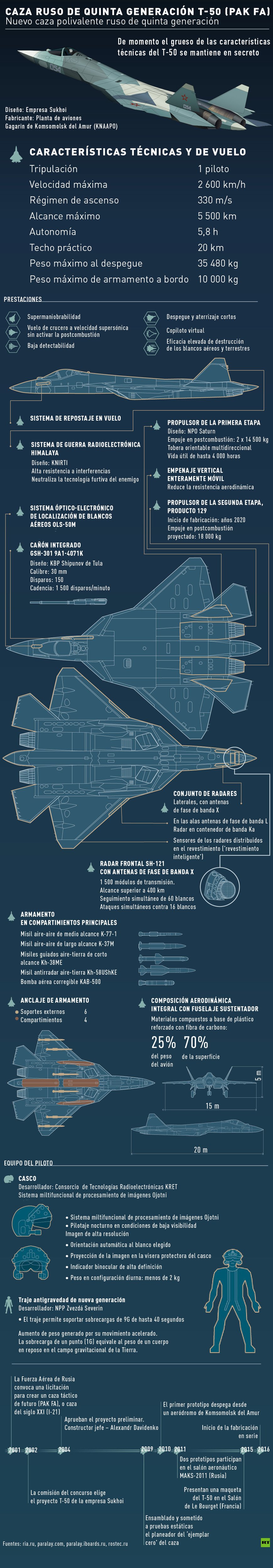 El caza puede alcanzar una velocidad de hasta 2.600 kilómetros por hora y tiene una autonomía de vuelo máxima de 5.500 kilómetros. La aeronave realizó su primer vuelo en 2010.