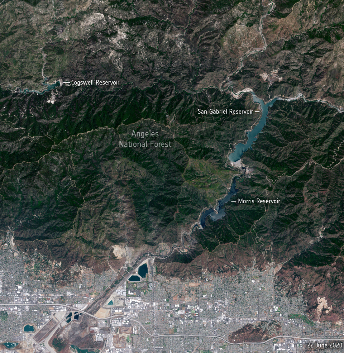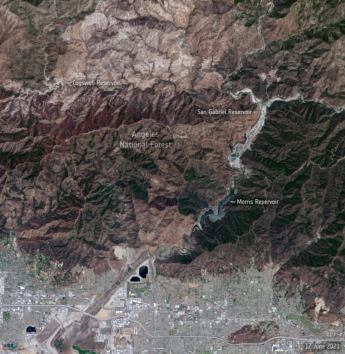 Se trata de dos fotos en las que se aprecia parte del bosque nacional de Ángeles y el embalse de San Gabriel, en el sur de California. Una de las imágenes fue tomada en junio de 2020, mientras que la otra se corresponde a junio de este año. El contraste entre ambas fotos resulta tan revelador como impactante.
