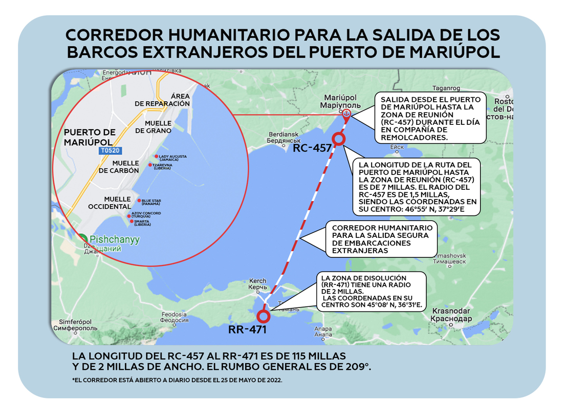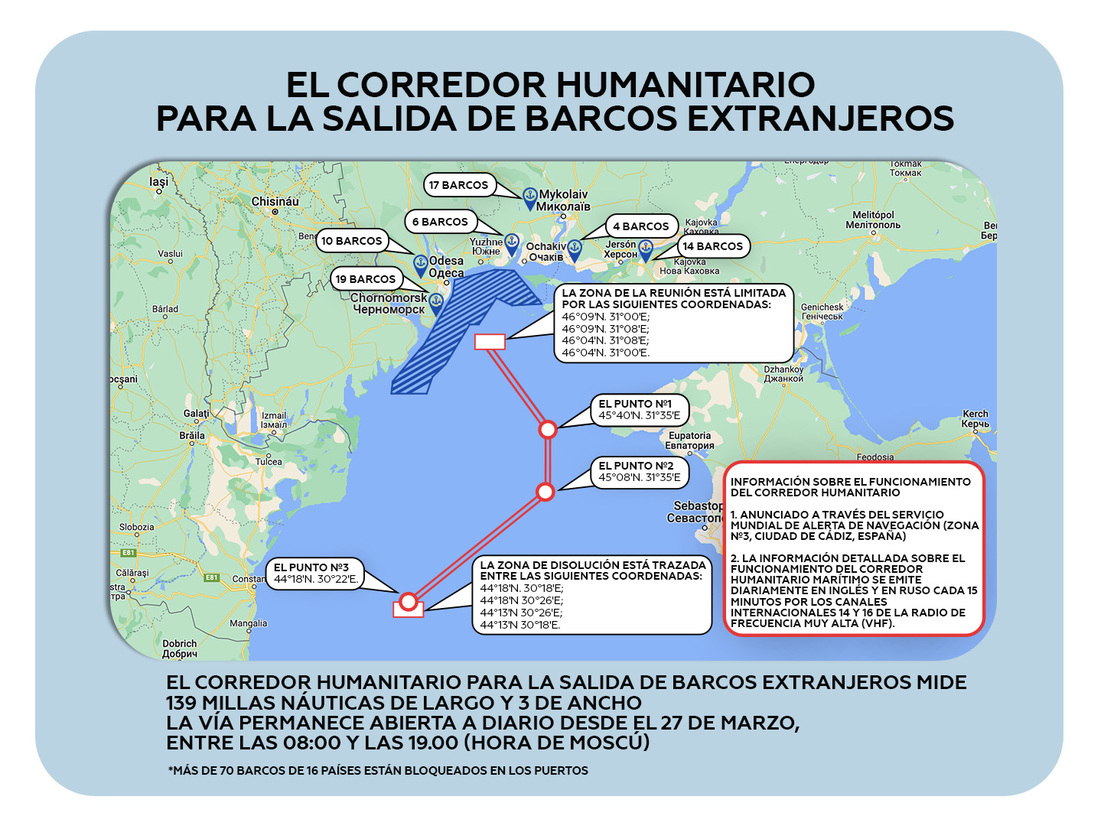 El Ministerio de Defensa de Rusia publicó este jueves dos mapas en los que explica el funcionamiento de dos corredores humanitarios creados para garantizar la salida segura de los barcos extranjeros bloqueados en el puerto de la ciudad de Mariúpol, así como los puertos ucranianos en el mar Negro.
