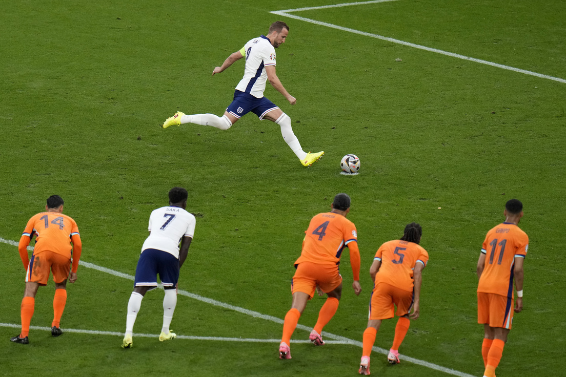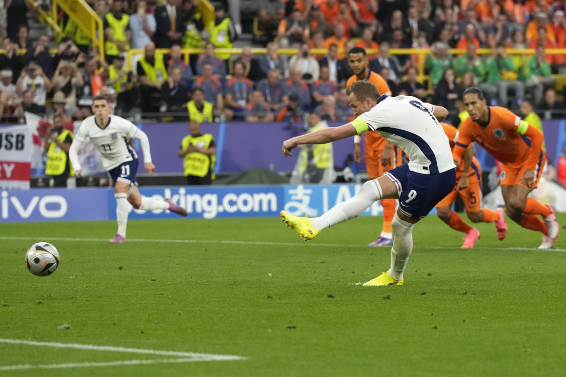 A pesar del marcador adverso, el equipo inglés no retrocedió y en el minuto 17 el defensor neerlandés Denzel Dumfries cometió falta con una entrada imprudente en el área sobre el capitán inglés, Harry Kane, por la que fue amonestado con tarjeta amarilla y les valió un penalti a sus oponentes.